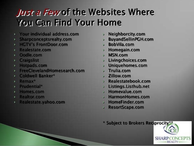Buying Your First Home . 1 Zillow 6 Homes.com. 2 : Trulia; 7 . MSN Real Estate: 3 Realtor.com 8 Rent.com. 4 . Yahoo Homes: 9 . AOL Real Discuss your thoughts on closing costs and what you learned about closing costs. Again you can use a print ... Retrieve Doc